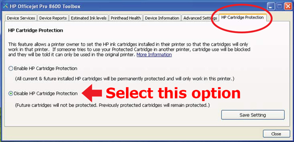 The HP Officejet 8100 and 8600 has a “cartridge protection” feature. In the toolbox there is a tab named “HP Cartridge Protection”, where you can choose if you want to enable or disable this function. The default setting here is “enable” which results in the cartridges only working in this particular printer. If you install the cartridges treated with this “protection” feature in another printer, they will not work and a message pops up.